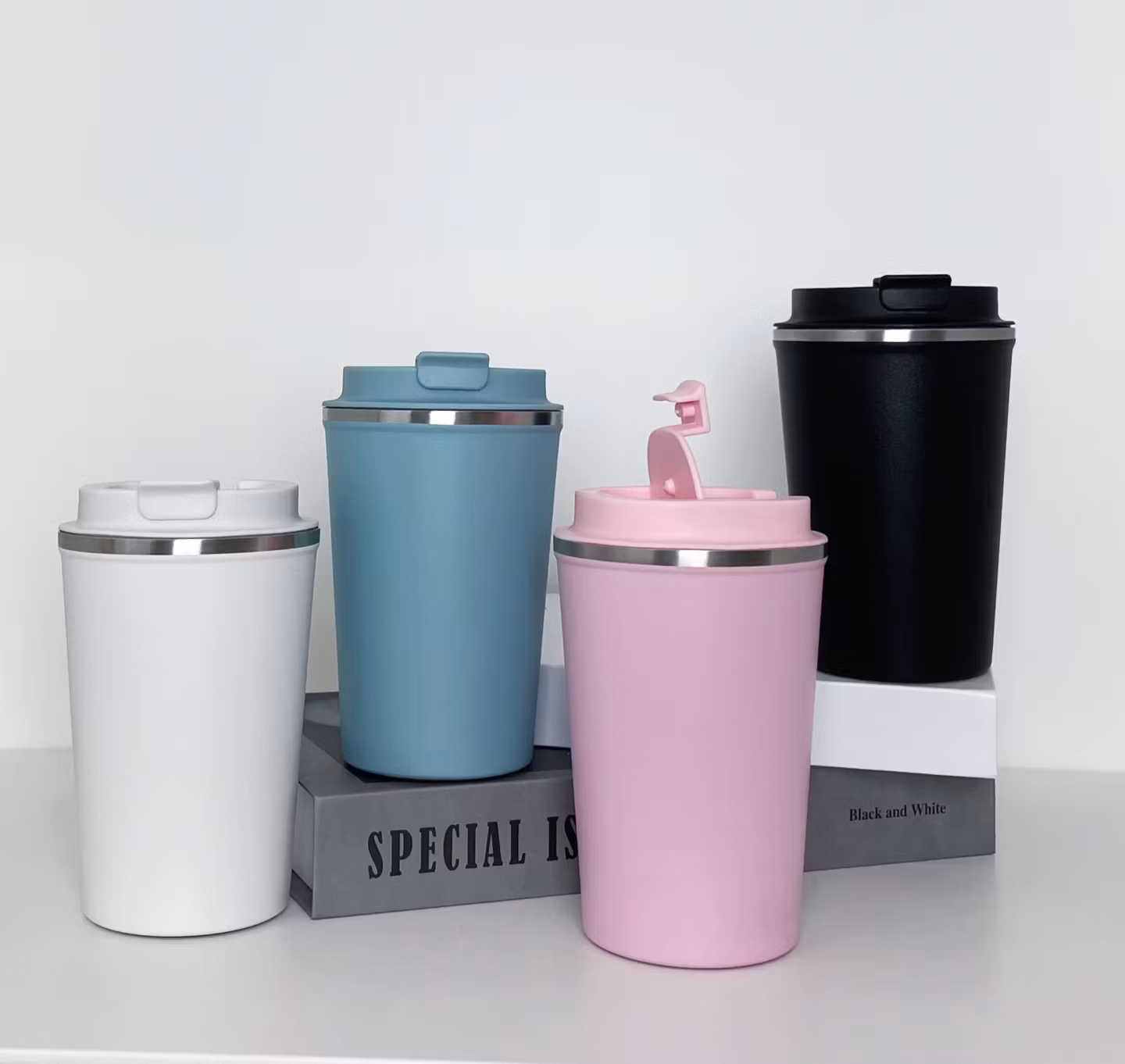 Termokopp i rustfritt stål. Skrulokk i plast med pakning. Anti-skli belegg under. Kapasitet 380ml. Tilgjengelig i 4 forskjellige farger: Sort, Blå, Rosa og